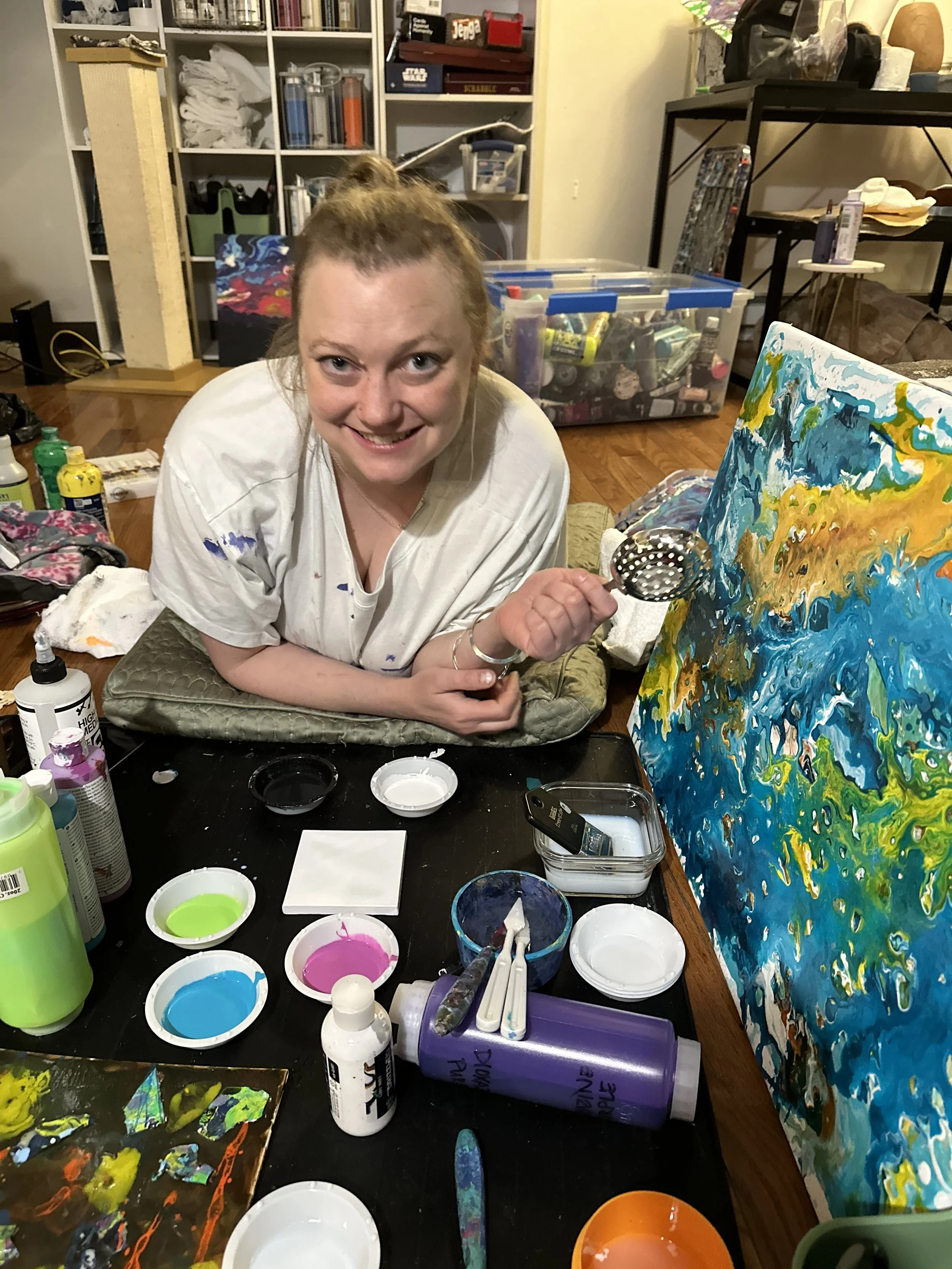Born, raised, and steeped in the majesty of the Santa Cruz Mountains, Erin only recently stumbled into her artistic expression. She marvels at, then explores with color and canvas, thoughts like, "what does living feel like, honestly?" and then, "what does it look like to feel?" The collection of paintings on display are snippets of her conversations with the universe.